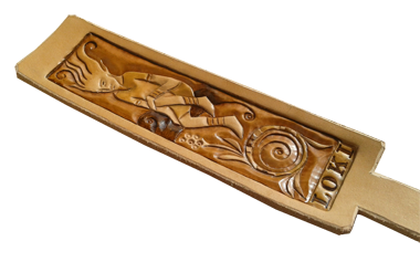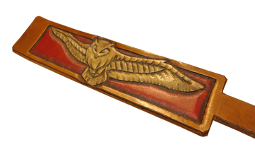 der den Speer Gungnir in der Hand trägt. Über ihm die Raben Hugin und Munin, unter ihm Sleipnir, sein achtbeiniges Pferd. Eigenes Design, dreifarbig (Braun, Gelb und Eigenfarbe des Leders) |