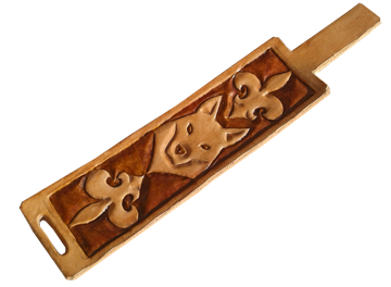 Auftragsanfertigung, Wunsch-Design mit französischen Lilien, und Schäferhundekopf, zweifarbig (Braun und Eigenfarbe des Leders) |