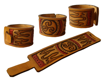 Armband mit Triskelen-Ornament, Wunsch-Design nach altem Armband, Maßanfertigung, 3-farbig, Braun, Rot und Eigenfarbe des Leders |