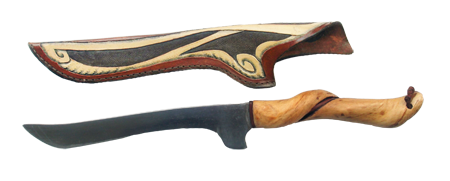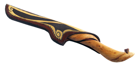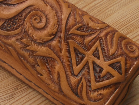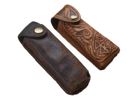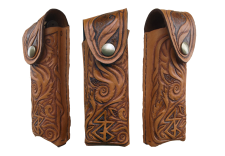 Für jedes Messer auf Maß gefertigt in verschiedenen Techniken mit geflochtenen Lederbändern oder einer versenkten Naht mit Wachsgarn oder Sehne. Je nach Wunsch mit Pflanzenornamenten oder Motiven aus der keltischen und nordischen Mythologie punziert.